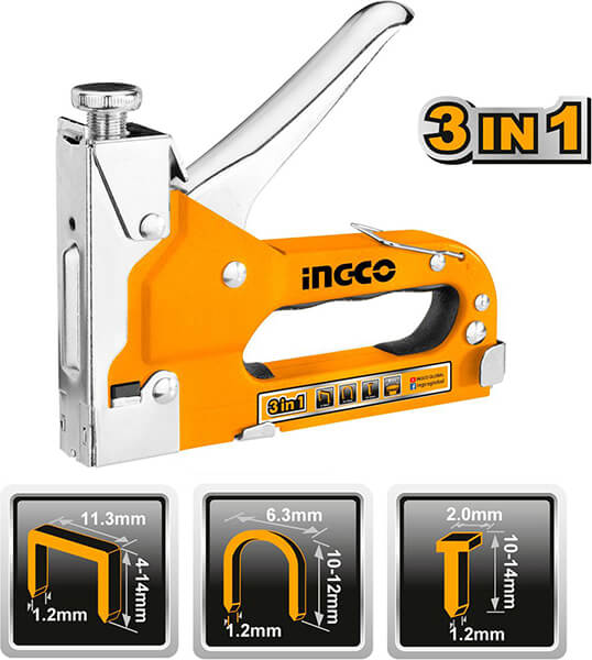 3 σε 1 Καρφωτικό - Συρραπτικό Χειρός. -Συρραπτικά σχήματος Π - διχάλων: πάχος: 1.2 mm, πλάτος: 11.3 mm, μήκος: 4-14 mm. -Συρραπτικά σχήματος U: πάχος: 1.2 mm, πλάτος: 6.3 mm, μήκος: 10-12 mm. -Καρφιά: πάχος: 1.2mm, μήκος: 4-14mm. -Ρύθμιση έντασης καρφώματος. Χαρακτηριστικά Υλικό: Ανοξείδωτο ατσάλι.Περιεχόμενα συσκευασίας: 200 τεμ. Συρραπτικά σχήματος Π, 200 τεμ. Συρραπτικά σχήματος U, 200 τεμ. Καρφιά.Βάρος: 0.70 Kg.Εγγύηση: 2 χρόνια.