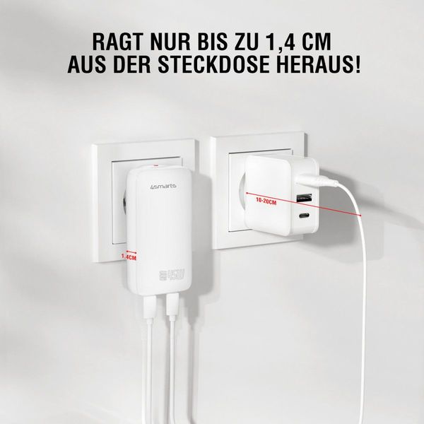 Με πάχος μόλις 1.4 cm, ο FlatPlug Slim Dual 45W εφαρμόζει τέλεια σε κάθε πρίζα χωρίς να προεξέχει. Είναι ιδανικός για δύσκολα προσβάσιμες πρίζες, όπως πίσω από το κρεβάτι ή τον καναπέ. Οι θύρες USB στην κάτω πλευρά βοηθούν στη διατήρηση των καλωδίων κοντά στον τοίχο, εξοικονομώντας χώρο. Περιλαμβάνει αναδιπλούμενο βύσμα ΗΠΑ και προσαρμογέα ΕΕ, καθιστώντας τον συμβατό με πρίζες σε περισσότερες από 120 χώρες - ιδανικός σύντροφος ταξιδιών.