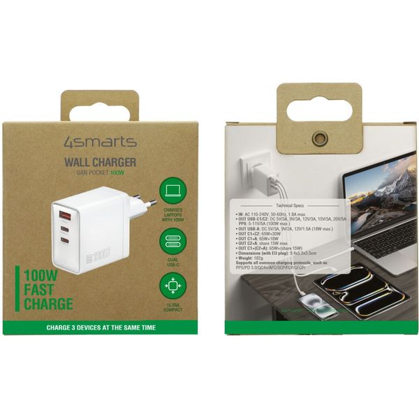 4SMARTS WALL CHARGER GAN POCKET 100W 2X TYPE-C + USB WHITE |