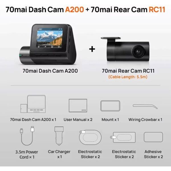 > > > 70MAI A200-1 FRONT & REAR DASH CAM W. SCREEN, SET WITH RC11 REARVIEW CAMERA, 1080P 60FPS 130FOV 500