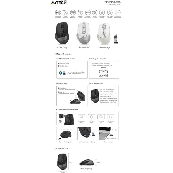 A4TECH στην κατηγορία ΠΟΝΤΙΚΙΑ Το A4TECH FB45CS Air είναι ένα έξυπνο, dual-mode ασύρματο mouse που συνδυάζει πρακτικότητα, φορητότητα και μοναδική λειτουργικότητα. Με δυνατότητα λειτουργίας τόσο σε κανονική χρήση (Desk Mode) όσο και στον αέρα (Air Mode), μετατρέπεται εύκολα σε multimedia controller χωρίς καμία εγκατάσταση λογισμικού. Υποστηρίζει έως και 3 συσκευές ταυτόχρονα μέσω Bluetooth & 2.4GHz, προσφέροντας απόλυτη ευελιξία για εργασία, παρουσίαση ή ψυχαγωγία. Οι αθόρυβες κλικ λειτουργίες, η ρυθμιζόμενη ευαισθησία DPI και η επαναφορτιζόμενη σχεδίαση το καθιστούν ιδανικό για απαιτητικούς χρήστες που θέλουν άνεση και παραγωγικότητα παντού.