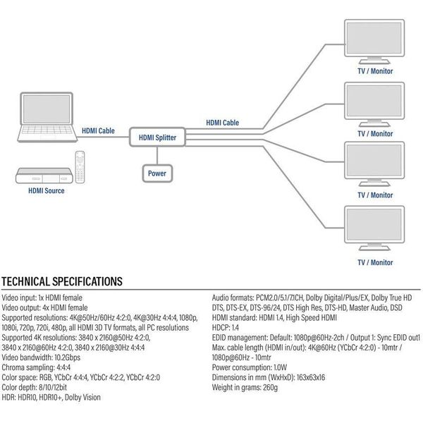 ACT AC7832 HDMI SPLITTER 4K HDMI SPLITTER 1 INPUT 4 HDMI OUTPUTS (PER.620757)