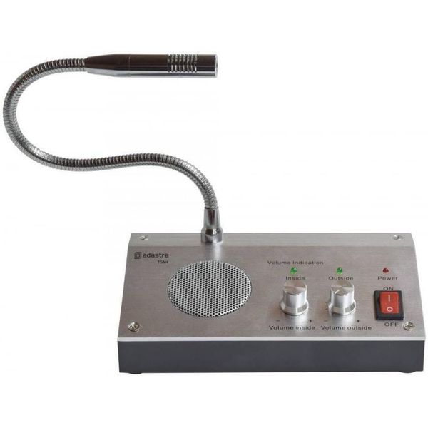 ADASTRA στην κατηγορία ΕΠΑΓΓΕΛΜΑΤΙΚΟΣ ΗΧΟΣ Το ADASTRA TGM4 είναι ένα ολοκληρωμένο σύστημα ενδοεπικοινωνίας με αμφίδρομη λειτουργία, ιδανικό για χρήση σε γκισέ εισιτηρίων, τραπεζών, βενζινάδικα και δεξιώσεις. Περιλαμβάνει μονάδα επιτραπέζιων ηχείων με μικρόφωνο και μονάδα επέκτασης ηχείων για καθαρή και κατανοητή επικοινωνία σε περιβάλλοντα με θόρυβο.