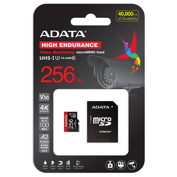 Οι κάρτες ADATA High Endurance microSDXC/SDHC UHS-I είναι κάρτες μνήμης υψηλής αντοχής, Video Speed Class 30 (V30) που έχουν σχεδιαστεί ειδικά για συνεχή εγγραφή και συνεχή επανεγγραφή. Είναι ιδανικές για κάμερες ταμπλό και συστήματα παρακολούθησης, καθώς και για κάθε άλλη εφαρμογή που απαιτεί αντοχή για αδιάκοπη εγγραφή. Επιπλέον, με μια βαθμολογία Application Performance Class 2 (A2), μπορούν να προσφέρουν στους χρήστες μια πιο γρήγορη και ομαλή εμπειρία εφαρμογής. Επιπλέον, μπορούν να χειριστούν ακραία περιβάλλοντα με τις αδιάβροχες, είναι αντικραδασμικές και ανθεκτικές στις ακτίνες Χ. Κατασκευασμένες με υψηλής ποιότητας τσιπ NAND Flash, οι κάρτες υψηλής αντοχής microSDXC/SDHC UHS-I είναι κατασκευασμένες για να αντέχουν έως και 80.000 ώρες εγγραφής βίντεο υψηλής ευκρίνειας. Χωρητικότητα: 256 Gb.Standard: SD 6.0.Speed Class: UHS Speed : Class 3, Speed Class: Class 10, Video Speed Class: V30, Application Performance Class: A2.Ταχύτητα ανάγνωσης: έως 100 MB/s.Ταχύτητα εγγραφής: έως 85 MB/s.Πιστοποιήσεις: CE, FCC, VCCI, EAC, RCM, UKCA, IC.Βάρος: 0.25 gr.Θερμοκρασία λειτουργίας: -25°C - +85°C.Διαστάσεις (M-Π-Υ): 15 x 11 x 1 mm.Συμβατότητα: Smartphone / Tablet / Dash Recorder / Motion Camera / Κάμερα παρακολούθησης.Εγγύηση: 2 χρόνια. DOA 7 ημερών