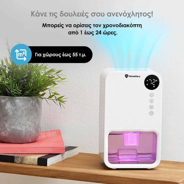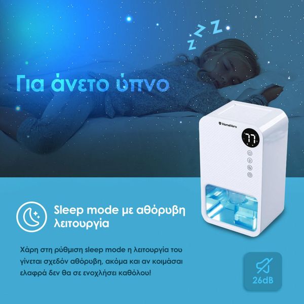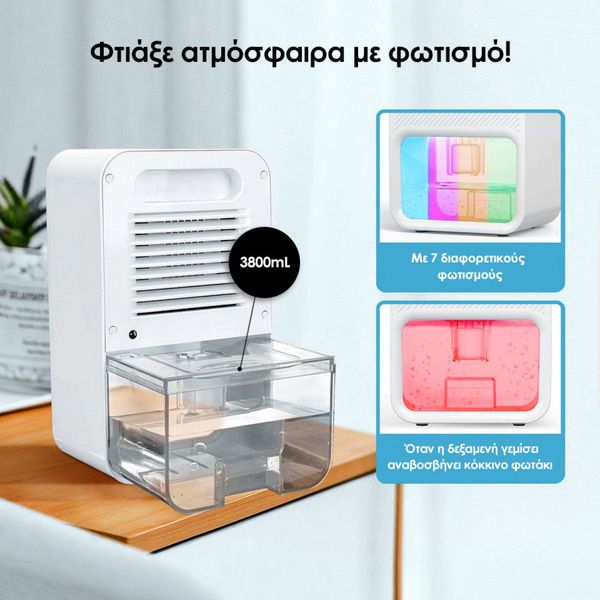 HomeVero HV-DH3800, ο νέος αποτελεσματικός και super οικονομικός αφυγραντήρας. Με τεχνολογία διπλού ημιαγωγού peltier, είναι ιδανικός για χώρους έως και 55τμ, βελτιώνει την ποιότητα του αέρα και προσφέρει αποτελεσματική προστασία από την υγρασία και τη μούχλα στο σπίτι και στα έπιπλα. Διαθέτει δοχείο 3800ml ώστε να μη χρειάζεται να τον αδειάζεις συνέχεια, αφού ακόμα και με 24ωρη λειτουργία θα γεμίσει σε 3-4 ημέρες. Ακόμα όμως κι αν ξεχάσεις να τον αδειάσεις, δε θα δεις το σπίτι σου να πλημμυρίζει. Ο ειδικός αισθητήρας σε προειδοποιεί με χαρακτηριστικό ήχο και κόκκινο φωτισμό, ενώ σταματάει η λειτουργία της συσκευής. Με διαστάσεις 23,8x13,5x37,2cm, βάρος 2,5kgr και πρακτική χειρολαβή, είναι ο ιδανικός φίλος που θα σε ακολουθήσει σε κάθε δωμάτιο του σπιτιού, ενώ μπορεί να είναι εκεί μαζί σου ακόμα και στις διακοπές. Το μοντέρνο design ταιριάζει παντού, ενώ ο εντυπωσιακός φωτισμός με 7 διαφορετικά χρώματα δίνει μια πιο fun νότα στο χώρο και τον καθιστά ιδανικό και για το παιδικό δωμάτιο, που δε χρειάζεται πλέον φωτάκι νυκτός. Η λειτουργία sleep mode, ουσιαστικά ελαχιστοποιεί το θόρυβο επιτρέποντας σας, ακόμα και αν κοιμάστε ελαφριά, να απολαύσετε ήσυχο και ξεκούραστο ύπνο.