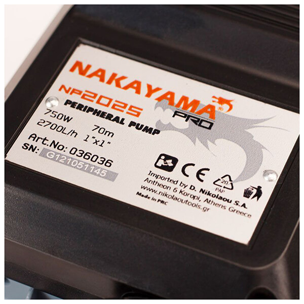 NAKAYAMA PRO NP2025 Αντλία Περιφερειακή 750W. -Mε μπρούτζινη φτερωτή για αντοχή στα άλατα και στη φθορά από μεγαλύτερα σωματίδια και σώμα από χυτοσίδηρο για μεγαλύτερη αντοχή. Διαθέτει θερμική προστασία και περιέλιξη χαλκού 100%. -Ρουλεμάν C&U. -Σώμα αντλίας από χυτοσίδηρο. -Μπρούτζινη φτερωτή. -Περιέλιξη: Χαλκού και θερμική προστασία. Ισχύς: 750W.Τάση: 230V/50Hz.Μέγιστη παροχή: 2700lt/h.Μέγιστο μανομετρικό ύψος: 70m.Στόμιο: 1".Βάρος: 8.1 kg.Εγγύηση: 2 χρόνια.