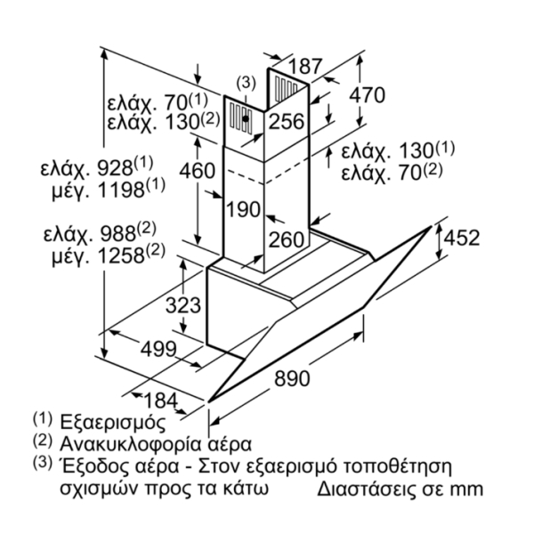 Διαστάσεις σε λειτουργία ανακύκλωσης (ΥxΠxΒ): 988-1258 x 890 x 499 mm.