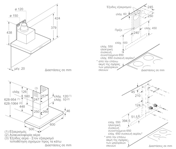 Διαστάσεις σε λειτουργία ανακύκλωσης (ΥxΠxΒ): 628-1064 x 600 x 500 mm.