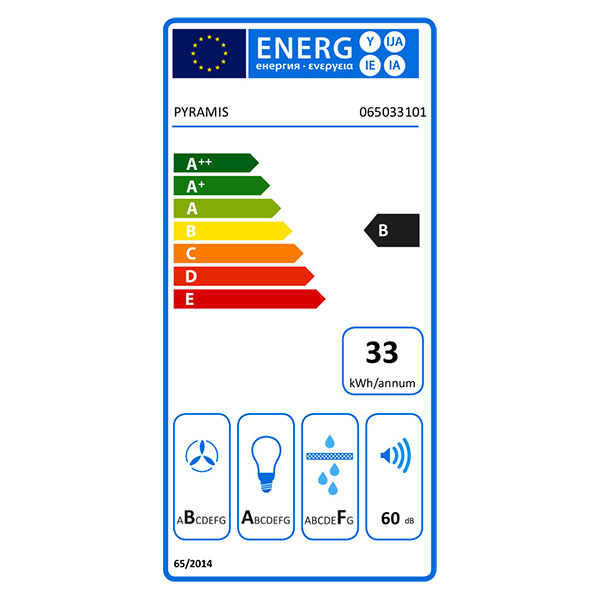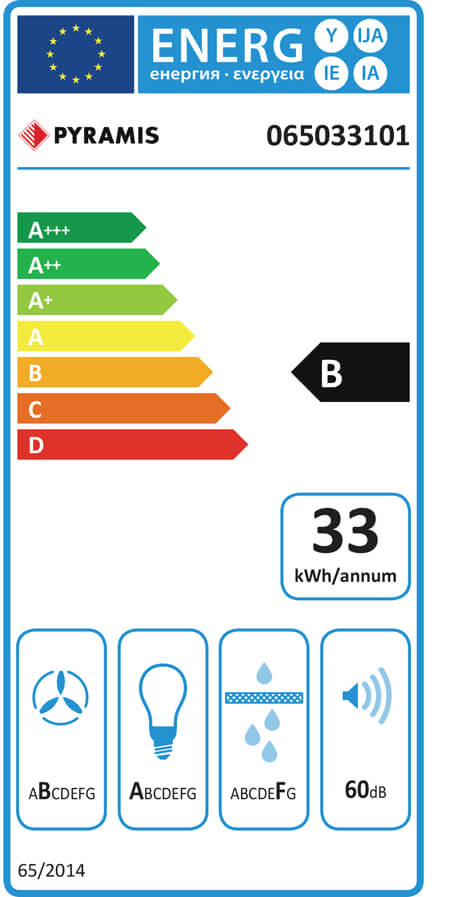 Δελτίο προιόντος Απορροφητήρας PYRAMIS ELEGANTO. Διακόπτες: Πατητοί.Επίπεδο θορύβου: 42-60dB.Διάσταση: 60cm.Λάμπες: Σποτ LED.Μοτέρ: 120W.Απορροφητικότητα: 700m3/h.Ενεργειακή κλάση: Β.Ετήσια κατανάλωση: 33 kWh/annum.Ρευστοδυναμική απόδοση: Β.Απόδοση φωτισμού: A.Απόδοση κατακράτησης λίπους: F.Χρώμα: Inox.Εγγύηση: 2 χρόνια.