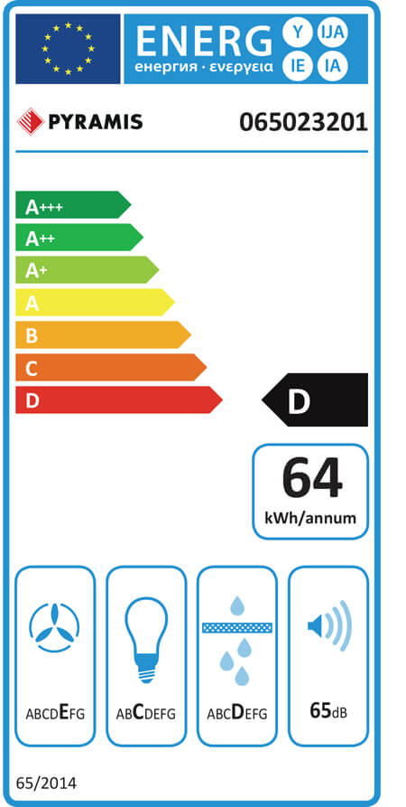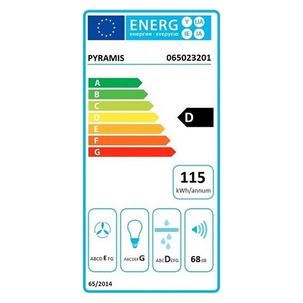 Δελτίο προιόντος Απορροφητήρας PYRAMIS FIERO. Διακόπτες: Αφής.Επίπεδο θορύβου: 54-68dB.Διάσταση: 90cm.Λάμπες: Σποτ LED.Μοτέρ: 190W.Απορροφητικότητα: 650m3/h.Ενεργειακή κλάση: D.Ετήσια κατανάλωση: 64 kWh/annum.Ρευστοδυναμική απόδοση: E.Απόδοση φωτισμού: G.Απόδοση κατακράτησης λίπους: D.Χρώμα: Λευκό.Εγγύηση: 2 χρόνια.
