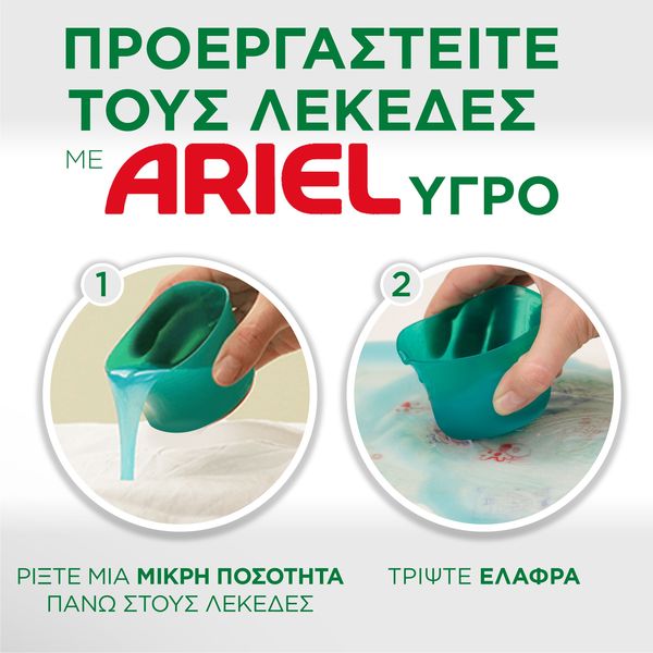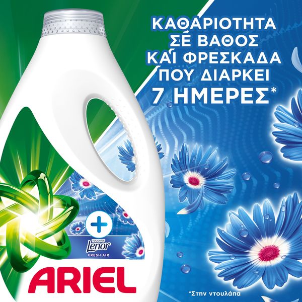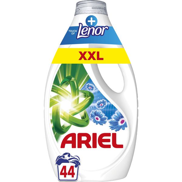 Το Ariel υγρό απορρυπαντικό (44 μεζούρες) προσφέρει εντατική αφαίρεση λεκέδων, ακόμη και σκληρών, από την πρώτη πλύση, διασφαλίζοντας πεντακάθαρα ρούχα χωρίς να τα φθείρει. Με το άρωμα Lenor (Touch of Lenor), χαρίζει φρεσκάδα που διαρκεί έως και 7 ημέρες. Μπορεί να χρησιμοποιηθεί και για προεργασία λεκέδων: ρίξτε απορρυπαντικό απευθείας στον λεκέ, τρίψτε με το καπάκι-δοσομετρητή, και μετά τοποθετήστε το καπάκι μέσα στον κάδο του πλυντηρίου.