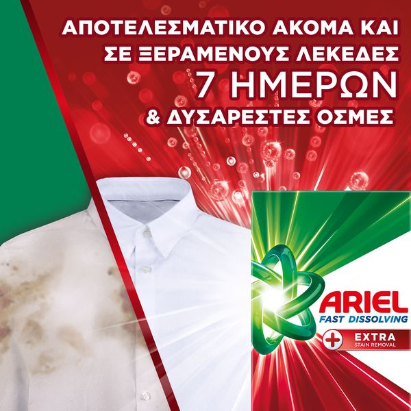 Ανακαλύψτε την πλύση χωρίς συμβιβασμούς με το Ariel Extra Clean σε σκόνη (62 μεζούρες). Σχεδιασμένο για βαθύ και αποτελεσματικό καθαρισμό, αφαιρεί μέχρι και «ξηρούς» λεκέδες έως 7 ημερών και αντιμετωπίζει οσμές με ευκολία. Ιδανικό για καθημερινή χρήση, ακόμα και σε κρύο νερό, διατηρώντας τα χρώματα ζωντανά και τα ρούχα φρέσκα από την πρώτη πλύση.