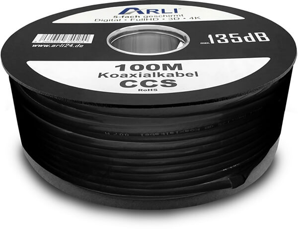 Oμοαξονικό καλώδιο ARLI μήκους 100 μέτρων για ψηφιακά και HD SAT συστήματα, με εσωτερικό αγωγό χάλυβα-χαλκού (CCS).Eίναι 5 φορές θωρακισμένο και εξασφαλίζει καλή προστασία από πηγές παρεμβολής και είναι ανθεκτικό στην υπεριώδη ακτινοβολία. Χαρακτηριστικά Εσωτερικός αγωγός: CCS 1.02 ± 0.01 mm, χάλυβας-χαλκός.Υλικό: PVC (ROHS) 7,2 ± 0,1 mm.Διαστάσεις θωράκισης: Μέγ. 135 dB.Για συστήματα: DVB-S, DVB-C, DVB-T, DVB-S2 και BK.Υποστήριξη:Full HD, έτοιμο για HD, υποστήριξη 3D.Μήκος: 100 μέτρα.Χρώμα: Μαύρο.Εγγύηση: 2 χρόνια. DOA 7 ημερών