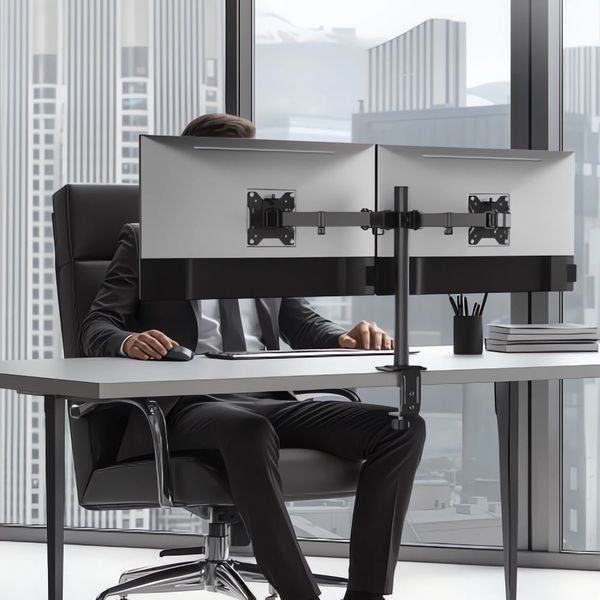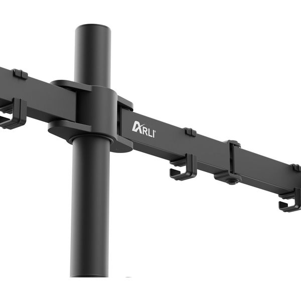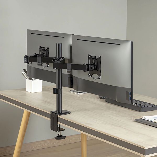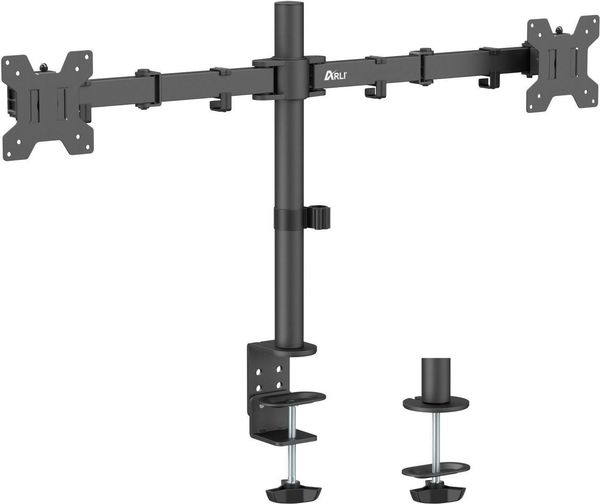 Η Βάση για 2 Οθόνες Γραφείου 17"-27" ARLI 1387 είναι μια εργονομική και ανθεκτική λύση για τοποθέτηση δύο οθονών σε γραφείο. Διαθέτει αρθρωτούς βραχίονες που επιτρέπουν ανακλίνηση, περιστροφή και ρύθμιση ύψους, προσφέροντας πλήρη ευελιξία στη διαμόρφωση της εργασιακής σας επιφάνειας. Η ενσωματωμένη διαχείριση καλωδίων διατηρεί το γραφείο σας οργανωμένο και καθαρό. Η βάση κατασκευάζεται από χάλυβα, αλουμίνιο και πλαστικό, με ματ μαύρο φινίρισμα για κομψή εμφάνιση. Είναι συμβατή με πρότυπα VESA 75x75 και 100x100 και μπορεί να υποστηρίξει οθόνες βάρους έως 10 kg η κάθε μία, ενώ το εύρος κλίσης της κυμαίνεται από +45° έως -45°, η περιστροφή από +90° έως -90° και η περιστροφή της οθόνης από +180° έως -180°. Είναι κατάλληλη για τοποθέτηση σε τραπέζι με πάχος 10-85 mm ή μέσω εισόδου καλωδίου 10-80 mm.