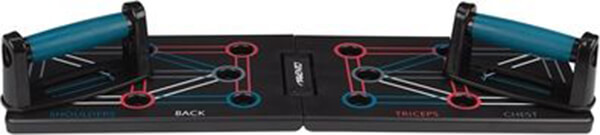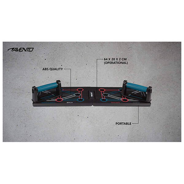 Το Avento Push-Up Board είναι μια καινοτόμος λύση για μια ολοκληρωμένη προπόνηση στο σπίτι. Τα 4 χρώματα στο ταμπλό αντιπροσωπεύουν 4 διαφορετικές ομάδες μυών που μπορούν να εκπαιδευτούν: πλάτη, στήθος, ώμους και τρικέφαλους μυς. Απλά τοποθετήστε τα υποστηρίγματα στο υποδεικνυόμενο χρώμα για να στοχεύσετε την επιθυμητή ομάδα μυών. Διαφορετικές ασκήσεις: 12.Υλικό: ABS.Λαβές: Ύψος: 8 cm, Πλάτος: 12.5 cm.Διαστάσεις (σε χρήση): 64 x 20 x 2 cm.Διαστάσεις (διπλωμένο): 32 x 20 x 4 cm.Μέγιστο βάρος χρήστη: 100 kg.Χρώμα: Μαύρο.Εγγύηση: 2 χρόνια.