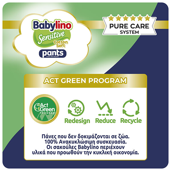Το προϊόν εμπίπτει στην κατηγορία μηδενικού Φ.Π.Α σύμφωνα με το διάταγμα (ΚΔΠ 349/2024) από 4 Νοεμβρίου 2024 μέχρι 31 Δεκεμβρίου 2025.Οι νέες πάνες-βρακάκι Babylino Sensitive Pants Cotton Soft είναι σχεδιασμένες με βάση το Σύστημα Αγνής Φροντίδας Pure Care System, που αποτυπώνει όλο το Σύστημα ελέγχων, πιστοποιήσεων και αυστηρών διαδικασιών διασφάλισης ποιότητας πίσω από την παραγωγή τους. Η τεχνολογία all around elastic προσφέρει 360ο ελαστικότητα περιμετρικά στη μεσούλα και στα ποδαράκια, αγκαλιάζει μοναδικά το σωματάκι του μωρού σε κάθε κίνηση και συγκρατεί την πάνα-βρακάκι σταθερή στη θέση της, χωρίς να «κρεμάει». Κατάλληλες για να διευκολύνουν την αλλαγή της πάνας και το στάδιο εκμάθησης της τουαλέτας, αφού ανεβοκατεβαίνουν εύκολα σαν κανονικό εσώρουχο, χωρίς απαραίτητα το μωρό να είναι σταθερό και σε ύπτια θέση.
