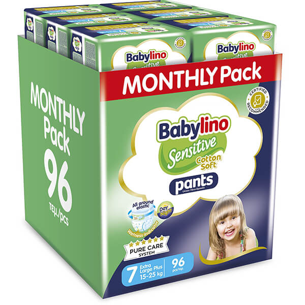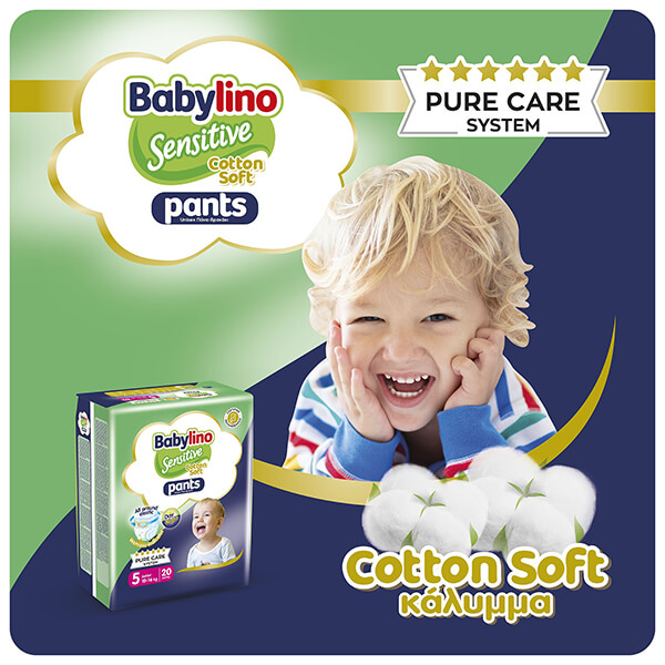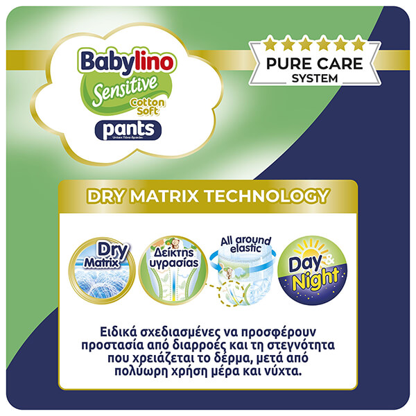 Το προϊόν εμπίπτει στην κατηγορία μηδενικού Φ.Π.Α σύμφωνα με το διάταγμα (ΚΔΠ 349/2024) από 4 Νοεμβρίου 2024 μέχρι 31 Δεκεμβρίου 2025.Οι νέες πάνες-βρακάκι Babylino Sensitive Pants Cotton Soft είναι σχεδιασμένες με βάση το Σύστημα Αγνής Φροντίδας Pure Care System, που αποτυπώνει όλο το Σύστημα ελέγχων, πιστοποιήσεων και αυστηρών διαδικασιών διασφάλισης ποιότητας πίσω από την παραγωγή τους. Η τεχνολογία all around elastic προσφέρει 360ο ελαστικότητα περιμετρικά στη μεσούλα και στα ποδαράκια, αγκαλιάζει μοναδικά το σωματάκι του μωρού σε κάθε κίνηση και συγκρατεί την πάνα-βρακάκι σταθερή στη θέση της, χωρίς να «κρεμάει». Κατάλληλες για να διευκολύνουν την αλλαγή της πάνας και το στάδιο εκμάθησης της τουαλέτας, αφού ανεβοκατεβαίνουν εύκολα σαν κανονικό εσώρουχο, χωρίς απαραίτητα το μωρό να είναι σταθερό και σε ύπτια θέση.