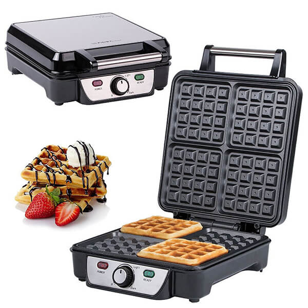 Βαφλιέρα με 4 θέσεις για τετράγωνες βάφλες 11 x 11 cm. Διαθέτει ισχύ 1100W και αντικολλητικές πλάκες έτσι ώστε να τις αφαιρείται όταν είναι έτοιμες.
