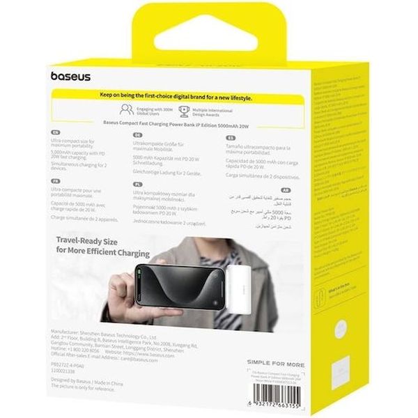 Κομψός και φορητός σχεδιασμός Παρά την ισχύ του, το Baseus Compact ξεχωρίζει για τον μικρό του όγκο και το βάρος μόλις 100g. Με διαστάσεις 80 x 40,2 x 25,6 mm, χωράει άνετα σε τσέπη ή τσάντα, ιδανικό για ταξίδια και καθημερινή χρήση.