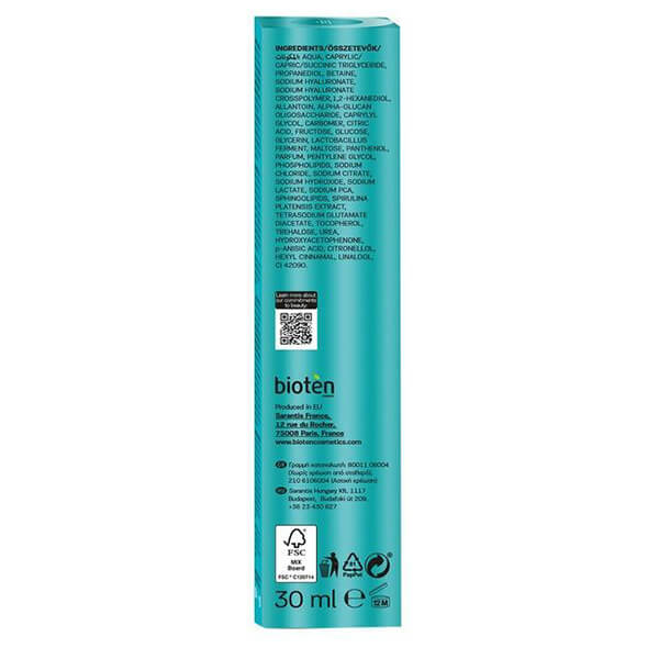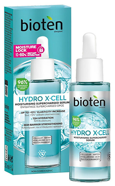 Ο supercharged ορός bioten HYDRO X?CELL, με 96 τοις συστατικά φυσικής προέλευσης, είναι η καθημερινή υπέρ-συμπυκνωμένη δόση που αυξάνει άμεσα τα επίπεδα ενυδάτωσης της επιδερμίδας! Η ελαφριά και ταυτόχρονα εξαιρετικά ενυδατική φόρμουλα περιέχει 5 τοις εκατό από ένα ισχυρό, πολλαπλής δράσης ενυδατικό σύμπλοκο με 100 τοις εκατό φυσικό Cellular Water από Σπιρουλίνα, Υαλουρονικό Οξύ και φυτικά Ceramides που προσφέρει άμεση ενυδάτωση έως 80 τοι εκατό και κλειδώνει την υγρασία έως και 72 ώρες. Το πλούσιο σε θρεπτικά συστατικά Spirulina Cellular Water με τη δύναμη του superfood ενισχύει αποτελεσματικά την ενυδάτωση της επιδερμίδας. Το Υαλουρονικό Οξύ βελτιώνει την ελαστικότητα καθώς βοηθά το δέρμα να γεμίσει με ενυδάτωση. Τα φυτικά Ceramides ενισχύουν τoν επιδερμικό φραγμό ώστε να διατηρείται η υγρασία στο δέρμα. Μη φαγεσωρογόνος σύνθεση.