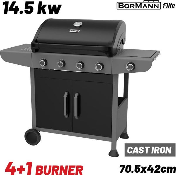 Η BORMANN FORGE BBQ6041 είναι μια ισχυρή και πρακτική ψησταριά υγραερίου 4+1 εστιών, σχεδιασμένη για άνετο και αποδοτικό ψήσιμο σε κάθε εξωτερικό χώρο. Με συνολική θερμική ισχύ 14.5 kW και 4 καυστήρες των 3 kW, προσφέρει σταθερή απόδοση και ομοιόμορφη κατανομή θερμότητας για άψογα αποτελέσματα σε κάθε γεύμα. Η μαντεμένια σχάρα με εμαγιέ επικάλυψη εξασφαλίζει αντοχή, σωστή διατήρηση της θερμοκρασίας και εύκολο καθάρισμα, ενώ η μεγάλη επιφάνεια ψησίματος 70.5x42 cm σου επιτρέπει να προετοιμάζεις ταυτόχρονα πολλά φαγητά για παρέες και οικογενειακά τραπέζια. Η ψησταριά διαθέτει πλευρική εστία 2.5 kW για σάλτσες και συνοδευτικά, καθώς και θέση για σούβλα, προσφέροντας ευελιξία και περισσότερες επιλογές ψησίματος. Το θερμόμετρο στο καπάκι και ο ρυθμιζόμενος θερμοστάτης επιτρέπουν ακριβή έλεγχο της θερμοκρασίας σε κάθε στάδιο. Για μέγιστη άνεση, η BBQ6041 είναι εξοπλισμένη με πλαϊνά ράφια, ντουλάπι για αποθήκευση και ροδάκια για εύκολη μετακίνηση. Το αποσπώμενο συρτάρι συλλογής λίπους και ο αφαιρούμενος συλλέκτης λίπους κάνουν τον καθαρισμό γρήγορο και απλό μετά από κάθε χρήση. - Θερμική Ισχύς: 14.5 kW