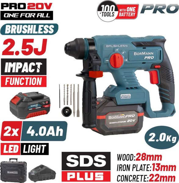BORMANN PRO BBP5301X44CA ΠΝΕΥΜΑΤΙΚΟ ΣΚΑΠΤΙΚΟ ΜΠΑΤΑΡΙΑΣ 20V,2X4AH,BRUSHLESS,2.5J,SDS-PLUS & ΒΑΛΙΤΣΑ (TLS.133654)