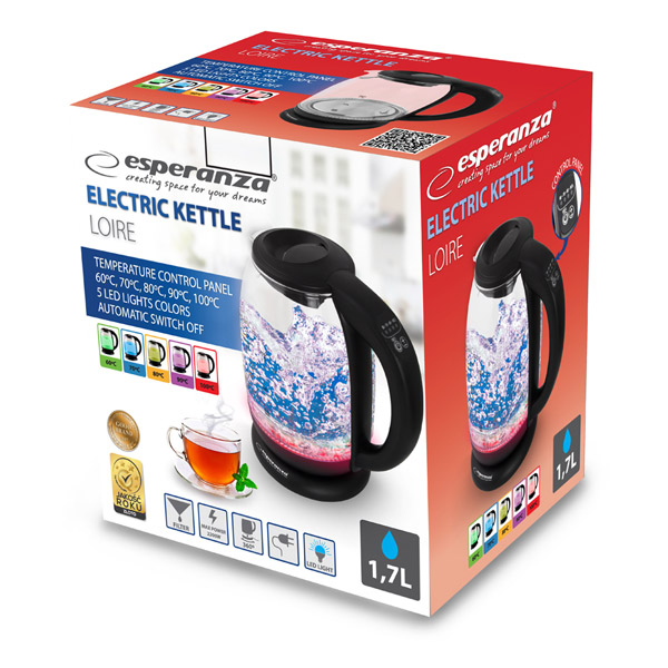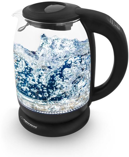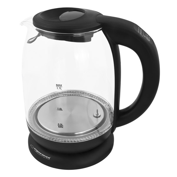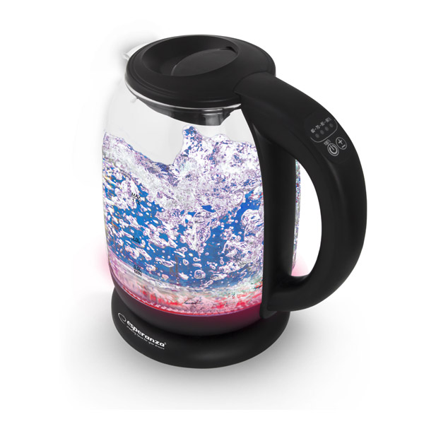Ο ηλεκτρικός βραστήρας ESPERANZA EKK027 διαθέτει δυνατή ισχύ 2200 W, έχει κανάτα από πυρίμαχο γυαλί χωρητικότητας 1.7 Lt, δείκτη στάθμης νερού με πολύχρωμο φωτισμό LED κατά τη διάρκεια βρασμού (5 διαφορετικά χρώματα ανάλογα με την θερμοκρασία του νερού), προστασία από την υπερθέρμανση και σβήνει αυτόματα όταν βράσει το νερό. Χρώμα: Μαύρο.Χωρητικότητα: 1,7L.Μέγιστη ισχύς: 2200W.Τροφοδοσία: 220-240V.Υλικό: Γυαλί, πλαστικό.Επιπλέον Χαρακτηριστικά: Boil dry safety cut-off, αυτόματη απενεργοποίηση μετά από βρασμό, καλυμένο θερμαντικό στοιχείο, δείκτης στάθμης ωερού.Βάρος: 0.932 Kg.Εγγύηση: 2 χρόνια.