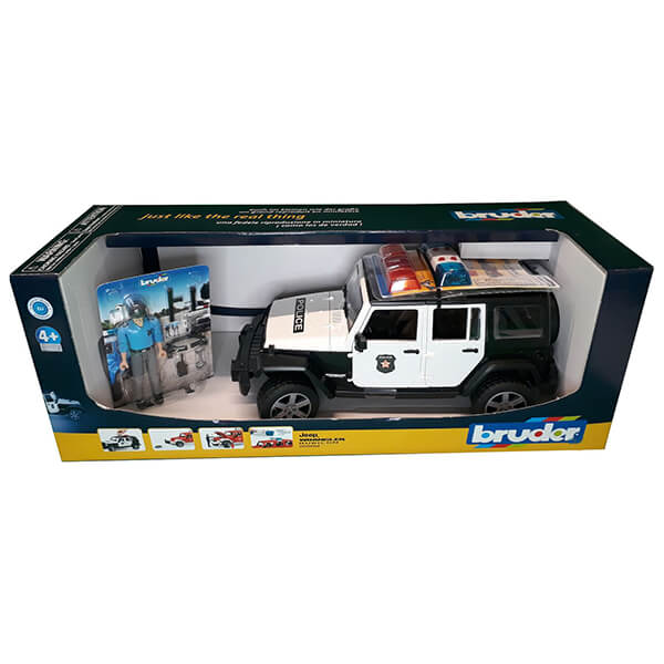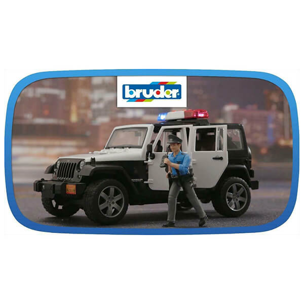 Αστυνομικό όχημα Jeep Wrangler Unlimited Rubicon. Το αστυνομικό όχημα βασίζεται στο γνωστό Jeep Wrangler Unlimited και διαθέτει την ελκυστική και εντυπωσιακή χρωματική σχεδίαση που είναι τυπική στις ΗΠΑ, καθώς και μια μονάδα προειδοποιητικού φωτός κινδύνου τοποθετημένη στην οροφή. Το Jeep Wrangler Unlimited Rubicon έχει σχεδιαστεί ως όχημα της αστυνομίας και παρέχει αμέτρητες λειτουργίες που επιτρέπουν σχεδόν απεριόριστη διασκέδαση και παιχνίδια. Εκτός από τη διμερή, αποσπώμενη οροφή τμήματος, το καπό, η πίσω πόρτα και οι τέσσερις πλαϊνές πόρτες ανοίγουν. Το όχημα παρέχει αρκετό χώρο στο εσωτερικό για τέσσερις φιγούρες BRUDER bworld. Εναλλακτικά, το πίσω κάθισμα μπορεί να αφαιρεθεί για να δημιουργηθεί χώρος για αξεσουάρ συμβατά με τις τυπικές υποδοχές BRUDER στην περιοχή φόρτωσης. Ο πρόσθετος σύνδεσμος έλξης προορίζεται για τη διευκόλυνση του συστήματος διεύθυνσης μέσω της καταπακτής οροφής και εάν δεν απαιτείται, μπορεί να αποθηκευτεί στο κάτω μέρος του αμαξώματος του οχήματος. Οι άξονες διαθέτουν τυπική ανάρτηση οχημάτων εκτός δρόμου και ελαστικά πέλματος με τροχούς σε ελκυστικό σχεδιασμό SUV. Η αστυνομική έκδοση του μοντέλου Jeep διαθέτει μια πρόσφατα αναπτυγμένη μονάδα φωτός και ήχου που διαθέτει τέσσερα λειτουργικά κουμπιά (1. ήχος κινητήρα, 2. σειρήνα αστυνομίας, 3. σειρήνα πυροσβεστικής υπηρεσίας, 4. σήμα yelp). Ο αστυνομικός του bworld είναι πλήρως εξοπλισμένος για να ενισχύσει την εξουσία. Η ζώνη μέσης διαθέτει σημαντικά εργαλεία για την καθημερινή εργασία της αστυνομίας, όπως φακό, συσκευή ασυρμάτου και μπαστούνι (γκλομπ). Ηλικία: 4+ (Δεν είναι κατάλληλο για παιδιά κάτω των 36 μηνών. Κίνδυνος πνιγμού - μικρά εξαρτήματα.)Υλικό: πλαστικά υψηλής ποιότητας όπως ABS.Κλίμακα: 1:16.Εγγύηση: 2 χρόνια. DOA 7 ημερών