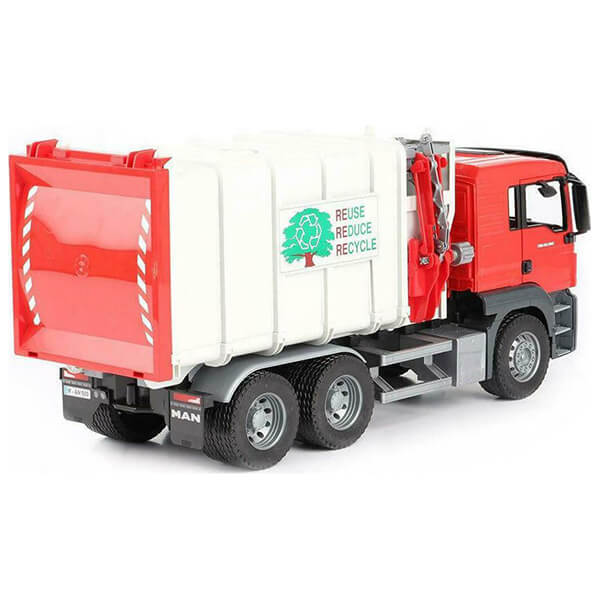 Φορτηγό συλλογής απορριμμάτων ίδιο με το πραγματικό μοντέλο της MAN. Συνοδεύεται από κάδους ανακύκλωσης ενώ στο πλάι υπάρχουν βραχίονες που τους ανυψώνουν, για να ξεφορτώσουν τα σκουπίδια στο εσωτερικό. Επίσης η καρότσα σηκώνεται προς τα πάνω για να ξεφορτώσει. -Προτεινόμενη ηλικία: κατάλληλο από 4 ετών και πάνω για παιχνίδι σε εσωτερικούς και εξωτερικούς χώρους. -Κατασκευασμένο από πλαστικά υψηλής ποιότητας όπως ABS. Υλικό: Πλαστικό.Κατάλληλη ηλικία: από 4 χρονών και πάνω.Κλίμακα μεγέθους: 1:16.Διαστάσεις: 54 x 19 x 25.7 cm.Χρώμα: Κόκκινο-Λευκό.Εγγύηση: 2 χρόνια. DOA 7 ημερών