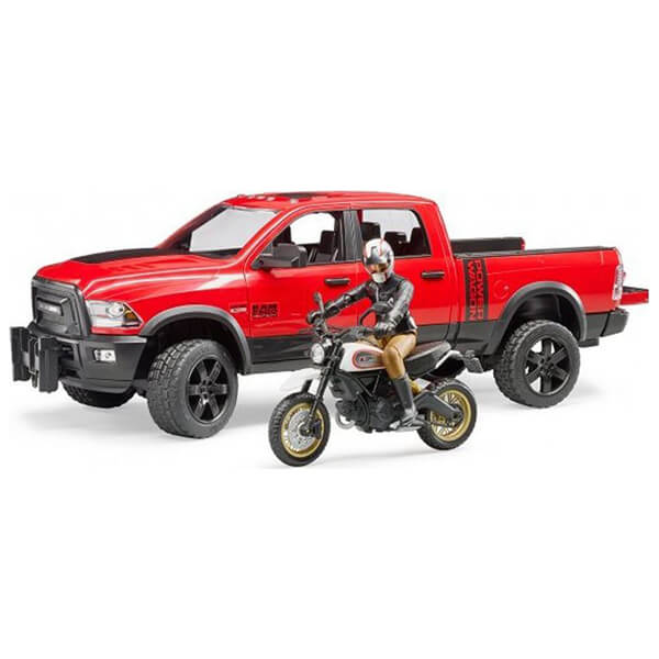 Φορτηγάκι Power Wagon με μοτοσυκλέτα και ανθρώπινη φιγούρα οδηγό-αναβάτη. Φτιαγμένο με ρεαλιστικές λεπτομέρειες επιτρέπει στο παιδί την αναπαράσταση συναρπαστικών σεναρίων. -Η μοτοσυκλέτα είναι μοντέλο Ducati Desert Sled τύπου enduro, για περιπέτειες εκτός δρόμου. -Το φορτηγάκι Ram Power Wagon μεταφέρει τη μηχανή στην πλατφόρμα φόρτωσης. Οι πόρτες του ανοίγουν και εντός μπορεί να χωρέσει η ανθρώπινη φιγούρα. -Το παιδί έχει τον χειρισμό της κατεύθυνσης του οχήματος, μέσω της προέκτασης του τιμονιού που βγαίνει στην οροφή. -Μπορεί να χρησιμοποιηθεί και σε εξωτερικά περιβάλλοντα χάρη στα ανάγλυφα ελαστικά που επιτρέπουν εύκολη κίνηση. -Διαθέτει αναρτήσεις για πιο ζωντανό χειρισμό. -Προτεινόμενη ηλικία: κατάλληλο από 4 ετών και πάνω για παιχνίδι σε εσωτερικούς και εξωτερικούς χώρους. -Δεν είναι κατάλληλο για παιδιά κάτω των 36 μηνών. Κίνδυνος πνιγμού - μικρά εξαρτήματα. Υλικό: Πλαστικό.Κατάλληλη ηλικία: από 4 χρονών και πάνω.Κλίμακα μεγέθους: 1:16.Διαστάσεις: 40 x 17 x 15 cm.Χρώμα: Κόκκινο.Εγγύηση: 2 χρόνια. DOA 7 ημερών