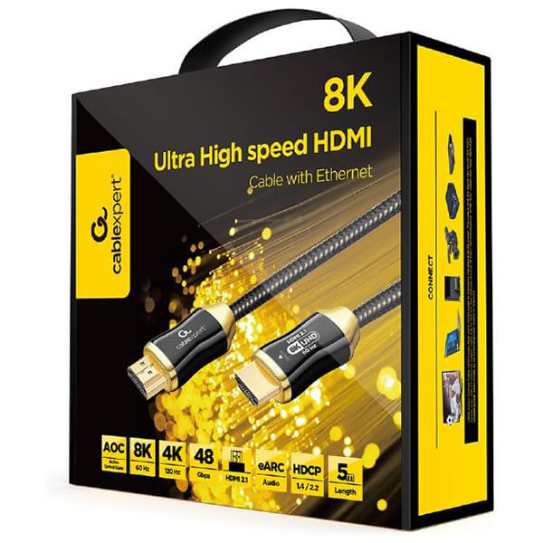 Kαλώδιο active optical (AOC) HDMI εξαιρετικά υψηλής ταχύτητας με Ethernet. -Τα καλώδια HDMI AOC χρησιμοποιούν τεχνολογία οπτικών ινών για τη μεταφορά του ψηφιακού σήματος HDMI. Αυτό σημαίνει ότι το σήμα μπορεί να μεταφερθεί πολύ πιο μακριά από ένα παραδοσιακό χάλκινο καλώδιο (έως 100 m) και μειώνει τον κίνδυνο παρεμβολών EMI/RFI. -Ανθεκτικό εξαιρετικά λεπτό πλεκτό καλώδιο υψηλής ποιότητας με κομψούς μεταλλικούς συνδέσμους. -Υποστηρίζει αναλύσεις 8K UHD στα 60Hz. -Επιχρυσωμένες υποδοχές για τέλεια ποιότητα εικόνας. -Συμβατό με όλες τις συσκευές που υποστηρίζουν HDMI. Χαρακτηριστικά Τύπος: Ultra High-speed AOC.Υποστήριξη έκδοσης HDMI: HDMI 2.1 (και όλες οι προηγούμενες εκδόσεις).Υποδοχές: 2 x Type-A αρσενικό, επίχρυσο.Εύρος ζώνης: 48 Gbps.Υποστηριζόμενες αναλύσεις: όλες οι αναλύσεις έως και UHD 8K (60Hz).Υποστήριξη αναλογίας εικόνας: Αναλογία διαστάσεων κινηματογράφου 21:9.Υποστήριξη Deep Color: έως και 16-bit ανά κανάλι.Χρωματικοί χώροι: YUV 4:4:4.Υποστηριζόμενα χαρακτηριστικά: EDID, CEC. HEC, HARC, HDR, Dolby Vision/Dolby ATMOS.HDCP: έκδοση 1.4 / 2.2.Υλικό αγωγού: Οπτικές ίνες.Πλέξη: Νάιλον.Μήκος: 5 m.Εγγύηση: 2 χρόνια. DOA 7 ημερών