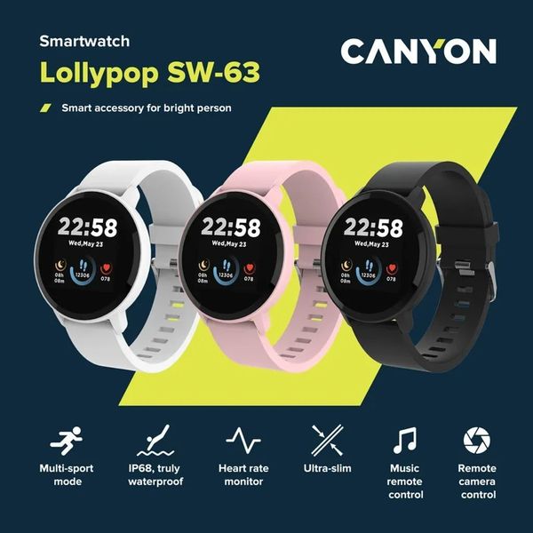CANYON στην κατηγορία SMARTWATCHES Το Smart Watch Lollypop SW-63 της Canyon συνδυάζει κομψό, στρογγυλεμένο σχεδιασμό με πρακτικές λειτουργίες ευεξίας και έξυπνης συνδεσιμότητας. Συνδέεται άμεσα με το smartphone μέσω Bluetooth 5.0 και λειτουργεί σε συνεργασία με την εφαρμογή Canyon Life, προσφέροντάς σας πλήρη εικόνα της φυσικής σας δραστηριότητας και της ποιότητας του ύπνου σας μέσα από ένα ευχάριστο και κατανοητό περιβάλλον.