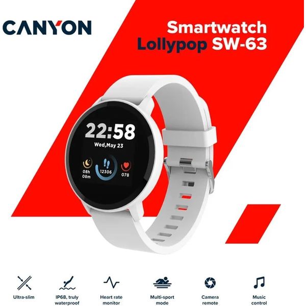 CANYON στην κατηγορία SMARTWATCHES Το Smart Watch Lollypop SW-63 της Canyon συνδυάζει κομψό, στρογγυλεμένο σχεδιασμό με πρακτικές λειτουργίες ευεξίας και έξυπνης συνδεσιμότητας. Συνδέεται άμεσα με το smartphone μέσω Bluetooth 5.0 και λειτουργεί σε συνεργασία με την εφαρμογή Canyon Life, προσφέροντάς σας πλήρη εικόνα της φυσικής σας δραστηριότητας και της ποιότητας του ύπνου σας μέσα από ένα ευχάριστο και κατανοητό περιβάλλον.