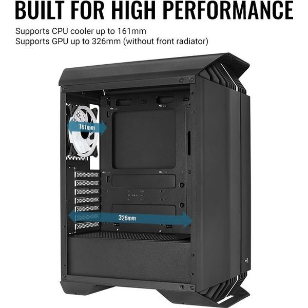 Υποστήριξη GPU: Έως 326mm (Χωρίς μπροστινό radiator) Υποστήριξη CPU Cooler: Έως 161mm Αποθηκευτικά μέσα: 2 x 3.5 HDD (1 x 3.5 και 1 x 3.5/2.5) & 3 x 2.5 SSD Είσοδοι I/O: 2 x USB 3.0, HD Audio & Mic, κουμπί επαναφοράς και τροφοδοσίας Διαχείριση καλωδίων: 24mm βάθος πίσω από τη μητρική πλακέτα Φίλτρα σκόνης: Μαγνητικά φίλτρα στο κάτω μέρος για εύκολη συντήρηση Τροφοδοτικό: ATX PSU (Περιλαμβάνονται καλώδια έως 160mm) Εγγύηση: 2 Χρόνια