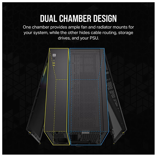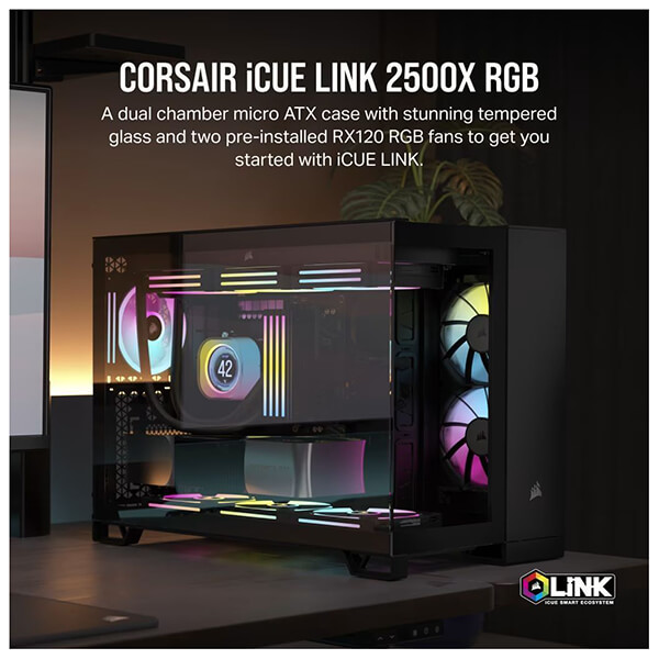 Η θήκη υπολογιστή CORSAIR iCUE LINK 2500X RGB Mid-Tower οργανώνει την προβολή του υπολογιστή σας με διπλά πάνελ σκληρυμένου γυαλιού και δύο προεγκατεστημένους ανεμιστήρες RX120 RGB. -Διπλοί θάλαμοι για βελτιωμένη εμφάνιση. Βεβαιωθείτε ότι η κατασκευή σας είναι καθαρή, οργανωμένη και με καλή ψύξη στον κύριο θάλαμο, ενώ κρύβετε τη δρομολόγηση καλωδίων, τις μονάδες αποθήκευσης και το τροφοδοτικό σας στο δεύτερο θάλαμο. -Περιλαμβάνονται ανεμιστήρες iCUE LINK (2x RX RGB Fans & System Hub). -Προσαρμόστε την ψύξης σας με χώρο για ανεμιστήρες έως και 9x 120mm ή 6x140mm, συμπεριλαμβανομένων των ευέλικτων επιλογών τοποθέτησης ψυγείου έως 240mm στο πλάι και έως 360mm στην οροφή και το κάτω μέρος. -Συμβατό με αντίστροφη υποδοχή μητρικών mATX & mITX. Συμβατότητα radiator: 120mm, 140mm, 240mm, 280mm, 360mm.Μέγιστο μήκος GPU: 400 mm.Μέγιστο ύψος ψύξης CPU: 180 mm.Μέγιστο μήκος PSU. 225 mm.Συμβατή υδρόψυξη: H60, H100i, H115i, H150i (All Series).Υποδοχές επέκτασης: 4.Υποδοχή σκληρού δίσκου: 2x 2.5'', 2x 3.5''.Συνδέσεις: 1x USB 3.2 Gen 2 Type C, 2x USB 3.2 Gen 1 Type A, 1x Audio in/out.Διαστάσεις (Υ-Μ-Π): 376 x 469 x 304 mm.Βάρος: 13.9 kg.Χρώμα: Μαύρο.Εγγύηση: 2 χρόνια. DOA 7 ημερών