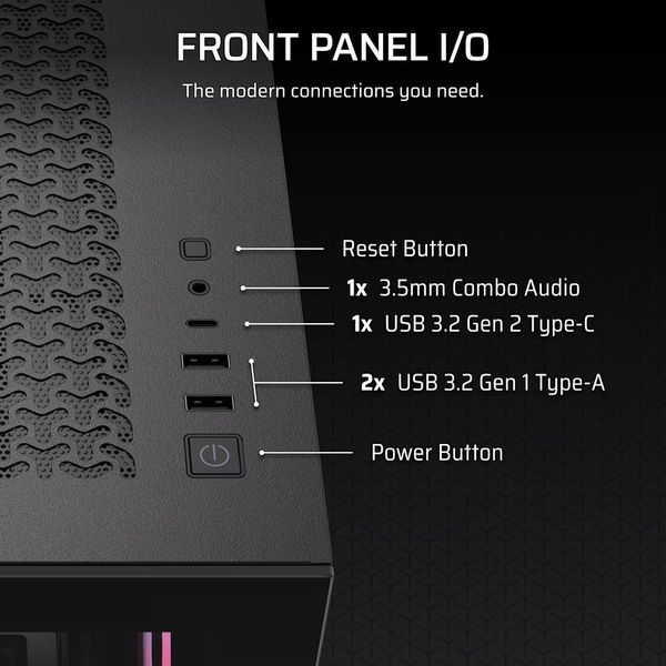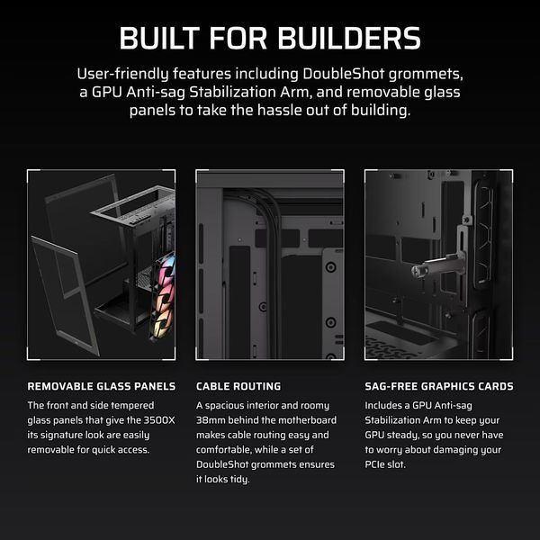 Το CORSAIR 3500X RS-R ARGB είναι ένα mid-tower case που συνδυάζει premium εμφάνιση, υψηλή ευελιξία και προηγμένη ψύξη, σχεδιασμένο για σύγχρονες gaming ή workstation συνθέσεις. Με πανοραμική όψη από διπλά tempered glass (μπροστά & πλάι), επιτρέπει πλήρη θέαση του συστήματος, ενώ η υποστήριξη για reverse-connector motherboards (ASUS BTF, MSI Project Zero, Gigabyte Stealth) εξασφαλίζει καθαρό και χωρίς καλώδια look. Περιλαμβάνει 3 ανεμιστήρες RS120-R ARGB με reverse rotor για καθαρή προβολή του φωτισμού και high-performance Magnetic Dome bearings. Με δυνατότητα τοποθέτησης έως και 10 ανεμιστήρων και ψυγείων έως 360mm στο πλάι και στην οροφή, το 3500X προσφέρει εξαιρετικές προοπτικές ροής αέρα και υδρόψυξης για high-end builds. Παρέχει επίσης άνετο cable-management με 45mm χώρο, αφαιρούμενα panel για εύκολο access, και ενσωματωμένο GPU anti-sag arm για προστασία των βαριών καρτών γραφικών.