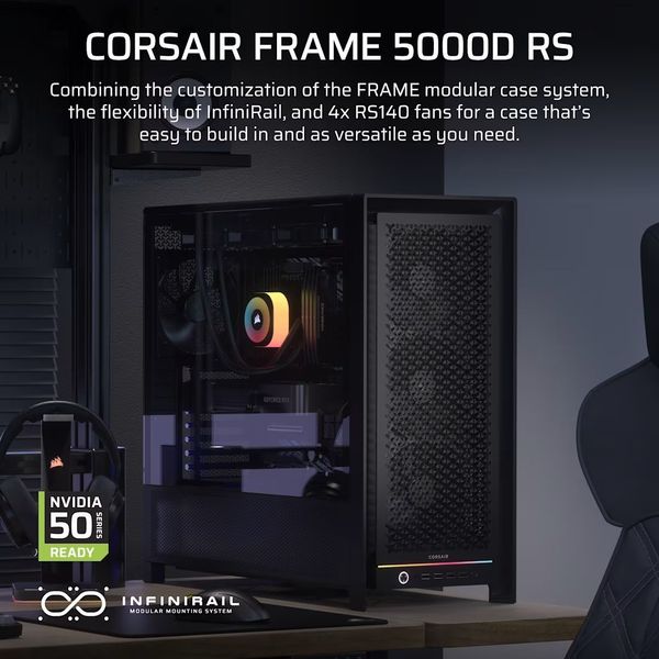 Το CORSAIR FRAME 5000D RS είναι ένα modular mid-tower κουτί που δίνει έμφαση στη ροή αέρα και στην ευκολία συναρμολόγησης. Με το σύστημα InfiniRail για ευέλικτες θέσεις ανεμιστήρων/ψυγείων, το ανανεωμένο RapidRoute 2.0 για τακτοποιημένη διαχείριση καλωδίων και συμβατότητα με reverse-connector μητρικές (ASUS BTF, MSI Project Zero, GIGABYTE Project Stealth), χτίζετε πιο καθαρά και πιο γρήγορα. Περιλαμβάνει 4x RS140 PWM ανεμιστήρες με αλυσιδωτή σύνδεση (daisy-chain) για απλή καλωδίωση και αθόρυβη λειτουργία, ενώ ο εμπρόσθιος μεταλλικός σχεδιασμός 3D Y-pattern αυξάνει τη ροή αέρα. Υποστηρίζει έως 14x 120mm ανεμιστήρες και τριπλά ψυγεία 360mm (οροφή/μπροστά/πλευρά) ή μέχρι 420mm επάνω, ώστε να καλύπτει άνετα high-end συστήματα με μεγάλες κάρτες γραφικών. Με αποσπώμενα tempered glass πάνελ και anti-sag GPU arm, προσφέρει premium αισθητική και πρακτικότητα για builds που ξεχωρίζουν. Χαρακτηριστικά Μορφή: Mid-Tower.Υλικά: Ατσάλι, Tempered Glass, 3D-Y Airflow Steel, πλαστικό.Υποστήριξη μητρικών: Mini-ITX, Micro-ATX, ATX, E-ATX (έως 305?277mm).Διαστάσεις (Υ?Β?Π): 542 ? 250 ? 556 mm.Χρώμα: Μαύρο.Θέσεις αποθήκευσης: 2? 3.5", 6? 2.5".PCIe slots: 8 οριζόντια ή 3 κατακόρυφα (riser προαιρετικό).Μέγ. μήκος GPU: έως 450 mm (με Anti-sag βραχίονα περιλαμβάνεται).Μέγ. ύψος ψύκτρας CPU: έως 175 mm.Τροφοδοτικό: ATX (δεν περιλαμβάνεται).Περιλαμβανόμενοι ανεμιστήρες: 4? RS140 PWM (σειρά RS, daisy-chain).Υποστήριξη ανεμιστήρων: Επάνω: 3?120/3?140 · Μπροστά: 3?120/3?140 ή 2?200 · Πλευρά: 3?120/3?140 · Πίσω: 1?120/1?140 · Κάτω: 4?120.Υποστήριξη ψυγείων: Επάνω: 420/360/280/240 mm · Μπροστά: 360/280/240 mm · Πλευρά: 360/280/240 mm · Πίσω: 140/120 mm.Front I/O: 1? USB-C 3.2 Gen2, 4? USB-A 3.2 Gen1, 1? combo audio/mic, πλήκτρο Power.Διαχείριση καλωδίων: RapidRoute 2.0 με pegboard, δεματικά/λοoms, χώρος ~42 mm.Συμβατότητα reverse-connector: Ναι (ASUS/MSI/GIGABYTE).Φίλτρα σκόνης: Ναι.Βάρος: 15.48 kg.Παράθυρο: Πλευρικό tempered glass.Εγγύηση: 2 Χρόνια. DOA 7 ημερών