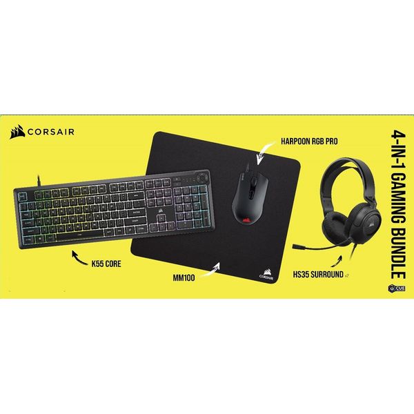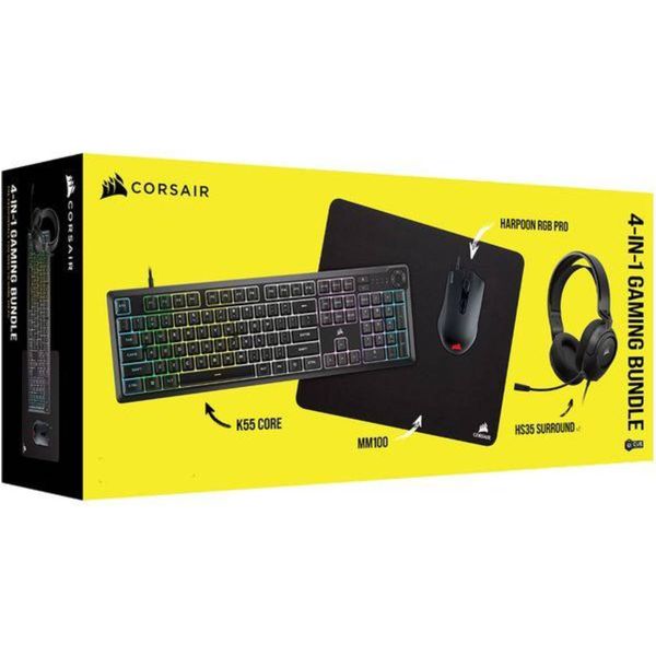 Ôï CORSAIR 4-in-1 Gaming Bundle åßíáé Ýíá ïëïêëçñùìÝíï ðáêÝôï gaming åîïðëéóìïý, éäáíéêü ãéá üóïõò èÝëïõí íá îåêéíÞóïõí Þ íá áíáâáèìßóïõí ôï setup ôïõò ìå áîéüðéóôá êáé áðïäïôéêÜ ðåñéöåñåéáêÜ. Ôï bundle ðåñéëáìâÜíåé ðëçêôñïëüãéï K55 CORE, ðïíôßêé HARPOON RGB PRO, headset HS35 SURROUND v2 êáé mousepad MM100, êáëýðôïíôáò ðëÞñùò ôéò áíÜãêåò ãéá gaming, åðéêïéíùíßá êáé Üíåóç. Ôï K55 CORE ðñïóöÝñåé áèüñõâïõò êáé ãñÞãïñïõò membrane äéáêüðôåò, RGB öùôéóìü 10 æùíþí êáé ðñáêôéêÜ media ðëÞêôñá, åíþ äéáèÝôåé áíôï÷Þ óå õãñÜ Ýùò 300ml ãéá åðéðëÝïí áóöÜëåéá. Ôï HARPOON RGB PRO ìå âÜñïò ìüëéò 85g êáé áéóèçôÞñá 12.000 DPI åîáóöáëßæåé áêñßâåéá êáé Üíåóç óå ðïëýùñï gaming. Ôï HS35 SURROUND v2 ðñïóöÝñåé êáèçëùôéêü Dolby 7.1 Surround Sound óå PC êáé Mac ìÝóù USB adapter, ìå Üíåôï ó÷åäéáóìü êáé êáèáñü ìéêñüöùíï. ÔÝëïò, ôï MM100 mousepad óõìðëçñþíåé éäáíéêÜ ôï óýíïëï ìå åðéöÜíåéá õøçëÞò áêñßâåéáò êáé áíôéïëéóèçôéêÞ âÜóç. - ÊáôáóêåõáóôÞò: CORSAIR.