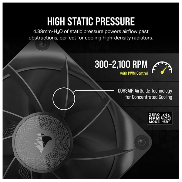 Ανεμιστήρας 120mm της Corsair με υψηλή στατική πίεση και ακριβή έλεγχο ταχύτητας με σύνδεση PWM. -Μεταφέρει τον αέρα μέσα στο κουτί όπως ποτέ άλλοτε σε χαμηλές, μεσαίες και υψηλές ταχύτητες. Οι ανεμιστήρες της σειράς RX παρέχουν υψηλή ροή αέρα και στατική πίεση, διατηρώντας παράλληλα τον θόρυβο όσο το δυνατόν χαμηλότερο. -Με στατική πίεση 4,38 mm-H2O, η σειρά RX είναι ιδανική για την προώθηση του αέρα μέσα από εμπόδια. -Το σχήμα αεροτομής των πτερυγίων και η καμπυλότητα των άκρων τους εξασφαλίζει μέγιστη απόδοση ροής αέρα. -Το ανθεκτικό υλικό κατασκευής των πτερυγίων αποτρέπει την κάμψη τους κάτω από διάφορους βαθμούς στατικής πίεσης. Αυτό διασφαλίζει βέλτιστη ροή σε οποιαδήποτε ταχύτητα. -Το ρουλεμάν του ανεμιστήρα ελαχιστοποιεί την τριβή και τον μηχανικό θόρυβο, επιτυγχάνοντας μια ισορροπία μεταξύ υψηλής απόδοσης ροής αέρα και χαμηλού ακουστικού αποτυπώματος. -Το πλαίσιο είναι ενισχυμένο και είναι ικανό να αντέχει σε υψηλότερες θερμοκρασίες, εφοδιασμένο με αποσβεστήρες κραδασμών για τη μείωση του θορύβου. -Με ελεγχόμενες ταχύτητες PWM μέσω iCUE LINK. Ρυθμίστε ακριβείς ταχύτητες ανεμιστήρα έως και 2.100 στροφές ανά λεπτό, παρέχοντας ταυτόχρονα ροή αέρα έως και 74,2 CFM στο σύστημά σας.