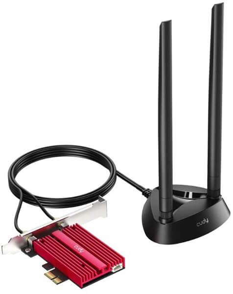 Ασύρματη κάρτα δικτύου της Cudy που συνδέεται σε μια διαθέσιμη υποδοχή PCI-e του υπολογιστή σας. Προσφέρει ταχύτητες ως και 3000Mbps. Είναι γενιάς Wi?Fi 6, το πιο σύγχρονο πρότυπο Wi-Fi που προσφέρει ταχύτητες έως και 40% παραπάνω από το Wi-Fi 5. Συντονίζει την επικοινωνία με τις συνδεδεμένες συσκευές ώστε να καταναλώνουν λιγότερη μπαταρία και λειτουργεί καλύτερα σε περιβάλλοντα με πολλές συσκευές Wi-Fi. Ιδανικό για σπίτια με πολλές έξυπνες συσκευές. Διαθέτει εξωτερικές κεραίες που εξασφαλίζουν μεγαλύτερο εύρος σύνδεσης. Ρυθμός Μεταφοράς Δεδομένων: 2.4 GHz: 574Mps, 5 GHz: 2400 Mbps.Πρότυπα δικτύωσης: IEEE802.11ax / ac/ a/ b/ g /n.Διεπαφή: PCI Express.Ισχύς μετάδοσης: WiFi: 19,5 dBm (μέγιστο), BT: 10 dBm.Bluetooth: Bluetooth 5.0.Συμβατή υποδοχή κάρτας: PCIE-16X/PCIE-4X/PCIE-8X/PCIE-1X.Συμβατότητα: Windows 10 64-bit.Διαστάσεις: 72 x 46 mm.Kεραίες εξωτερικές: 2x 5dBi.Μέγεθος κεραίας: 94.5 x 221.5 mm.Θερμοκρασία λειτουργίας: 0°C - 40°C.Εγγύηση: 2 χρόνια. DOA 7 ημερών