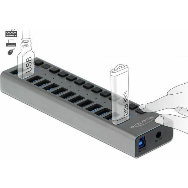 DELOCK στην κατηγορία USB HUB Το Delock USB Hub 5 Gbps με 13 Θύρες και Διακόπτη είναι ένας ισχυρός και αξιόπιστος κόμβος USB με ανθεκτικό μεταλλικό περίβλημα, σχεδιασμένος για να επεκτείνει σημαντικά τη συνδεσιμότητα ενός υπολογιστή ή φορητού υπολογιστή. Συνδέεται μέσω θύρας USB Type-A και προσθέτει δεκατρείς επιπλέον θύρες USB Type-A, επιτρέποντας τη σύνδεση πολλών περιφερειακών συσκευών ταυτόχρονα, όπως εξωτερικοί δίσκοι, USB flash drives, πληκτρολόγια, ποντίκια ή smartphones.