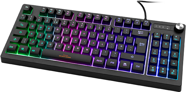 Με το DK230 έχετε το μικρό μέγεθος ενός πληκτρολογίου TKL αλλά με τις λειτουργίες στο numpad. Αυτό το πληκτρολόγιο RGB καταλαμβάνει λίγο χώρο στην επιφάνεια εργασίας σας, το κουμπί ρύθμισης στην επάνω δεξιά γωνία διαθέτει λειτουργία πολλαπλών λειτουργιών που σας επιτρέπει να προσαρμόσετε τόσο την ένταση όσο και τον φωτισμό. Δεν απαιτείται λογισμικό για τον έλεγχο του RGB σε αυτό το πληκτρολόγιο.
