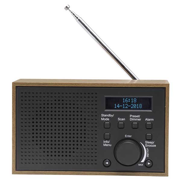 Ραδιόφωνο DENVER DAB-46. Χαρακτηριστικά: - Ψηφιακό ραδιόφωνο DAB+ και επίσης ενσωματωμένο ραδιόφωνο FM. - Chipset: FBI. - Οθόνη LCD. - Ρυθμίζει αυτόματα το ρολόι μέσω DAB. - Λειτουργία ξυπνητηριού - Αφύπνιση με μελωδία, ραδιόφωνο DAB ή FM. - Ισχύς εξόδου: 2W RMS. - Τηλεσκοπική κεραία. - Μπορεί να χρησιμοποιηθεί με παρεχόμενο προσαρμογέα ή μπαταρίες 4 x μεγέθους "AA" (οι μπαταρίες δεν περιλαμβάνονται). Εξοδος ηχείων: 2 W.Διαστάσεις: 17.00 x 9.50 x 10.20 cm.Βάρος: 0.72 kg.Χρώμα: Καφέ/Μαύρο.Εγγύηση: 2 χρόνια. DOA 7 ημερών