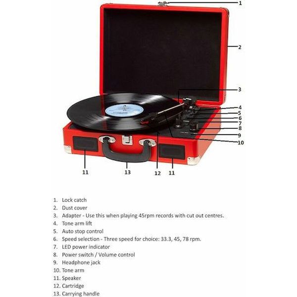 Πικάπ USB με λογισμικό εγγραφής υπολογιστή DENVER VPL-120. Χαρακτηριστικά: - Περιλαμβάνεται πικάπ USB με λογισμικό εγγραφής υπολογιστή. - Λειτουργεί και ως κανονικό πικάπ με ενσωματωμένα ηχεία & σύνδεση phono στο πίσω μέρος για σύνδεση με σύστημα μουσικής. - Μπορεί να παίξει δίσκους βινυλίου 331/3 rpm, 45rpm ή 78rpm. - Εγγραφή από LP σε υπολογιστή χρησιμοποιώντας καλώδιο USB και λογισμικό υπολογιστή που περιλαμβάνεται. - Λειτουργία αυτόματης διακοπής του βραχίονα. - Έρχεται σε ωραίο σχέδιο βαλίτσας για εύκολη μεταφορά. - Ισχύς εξόδου από ηχεία: 2 x 1W. Διαστάσεις: 35.20 x 26.50 x 12.00 cm.Βάρος: 2.96 kg.Χρώμα: Κόκκινο.Εγγύηση: 2 χρόνια. DOA 7 ημερών