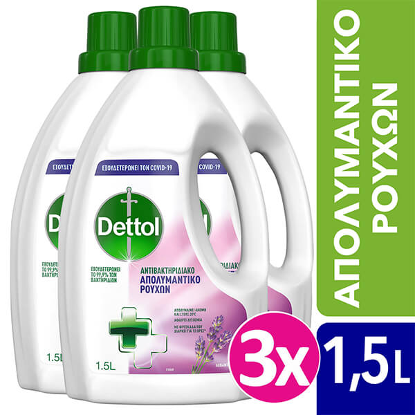 DETTOL στην κατηγορία ΠΡΟΙΟΝΤΑ ΚΑΘΑΡΙΣΜΟΥ Το Dettol Απολυμαντικό για τα ρούχα είναι το προϊόν που εξουδετερώνει το 99.9% των βακτηριδίων ακόμα και σε πλύσεις με κρύο νερό ή σύντομες πλύσεις. Χρησιμοποιείται μαζί με το απορρυπαντικό για πλύσιμο στο πλυντήριο και στο χέρι κατά το ξέβγαλμα. Απολυμαίνει τα ρούχα και εξαφανίζει δυσάρεστες οσμές αφήνοντας ένα ευχάριστο άρωμα καθαριότητας. Είναι κατάλληλο για λευκά και χρωματιστά καθώς δεν καταστρέφει τις ίνες των ρούχων. Συνιστάται ιδιαίτερα για υφάσματα που έρχονται σε άμεση επαφή με το δέρμα όπως εσώρουχα, κάλτσες, μωρουδιακά, αθλητικές φόρμες, πυτζάμες, νυχτικά.Ιδανικό και για πλύσιμο σε θερμοκρασίες ακόμα και κάτω των 30 βαθμών Κελσίου κάτι που διασφαλίζει οτι τα ρούχα σας θα είναι καθαρά σε οποιαδήποτε θερμοκρασία εσείς επιλέξετε να τα πλύνετε.