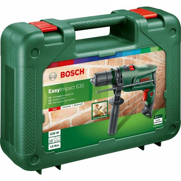 Το Bosch EasyImpact 630W xρησιμοποιείται για βίδωμα, ξεβίδωμα και για διάτρηση δομικών υλικών, καθώς μπορεί να τρυπήσει χάλυβα με διάμετρο έως 10mm, ξύλο με διάμετρο έως 25mm και τοιχοποιία με διάμετρο έως 13mm. Η δράση της κρούσης προσφέρει υψηλή ισχύ που μπορεί να καλύψει τις ανάγκες των πιο απαιτητικών εργασιών εύκολα και γρήγορα. Επιπλέον έχει δυνατότητα προσαρμογής της ταχύτητας έως 3000rpm, ώστε να τη ρυθμίζετε ανάλογα με την εργασία που έχετε να κάνετε. Τεχνικά Χαρακτηριστικά: Ονομαστική ισχύς: 630 W.Μέγιστη ισχύς εξόδου: 370 W.Ονομαστική ροπή στρέψης: 1.5 Nm.Ροπή ακινησίας: 15,0 Nm (σύμφωνα με το πρότυπο EN 60745).Ονομαστικές στροφές: 50 3.000rpm.Αριθμός κρούσεων: 48.000 min-1.Διάμετρος τρυπήματος τοιχοποιία: 13 mm.Διάμετρος τρυπήματος σε χάλυβα: έως 10 mm.Δάμετρος τρυπήματος σε ξύλο: έως 25 mm.Βαλίτσα μεταφοράς: Περιλαμβάνεται.Διαστάσεις (ΜxΠxΥ): 290 x 68 x 221 mm.Βάρος: 1,700 kg.Εγγύηση: 2 χρόνια.