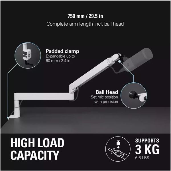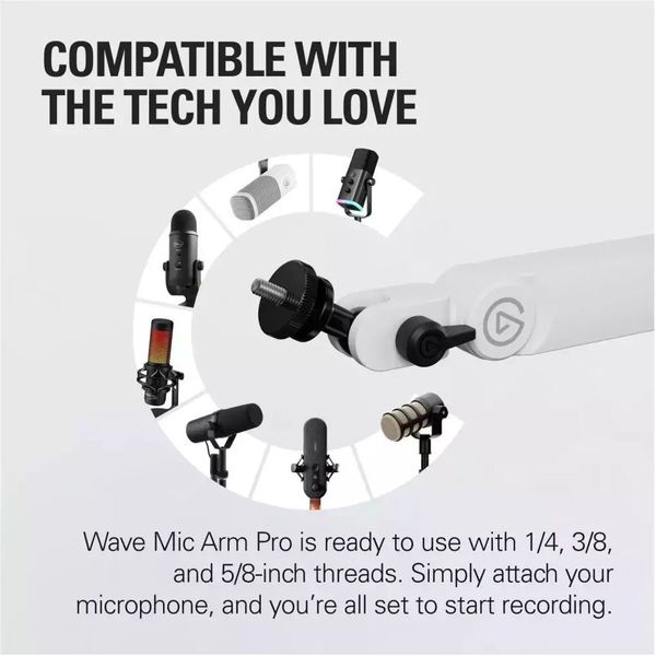 Το Wave Mic Arm Pro – White αποτελεί την κορυφαία επιλογή στήριξης μικροφώνου για επαγγελματίες δημιουργούς περιεχομένου. Με χαμηλό προφίλ για καθαρή οπτική στο setup σας, προσφέρει εξαιρετικά ομαλές και αθόρυβες κινήσεις χάρη στην αναβαθμισμένη τεχνολογία ανάρτησης. Η στιβαρή μεταλλική κατασκευή και τα εναλλάξιμα καλύμματα μεντεσέδων προσφέρουν τόσο λειτουργικότητα όσο και αισθητική προσαρμογή. Είτε κάνετε streaming είτε εγγραφή podcast, το Wave Mic Arm Pro ενσωματώνεται απόλυτα στον χώρο σας, διατηρώντας πάντα τον έλεγχο και την καθαρότητα του ήχου σας. - Κατασκευή: Πλήρως μεταλλική με σύστημα χαμηλού προφίλ και αθόρυβη λειτουργία.