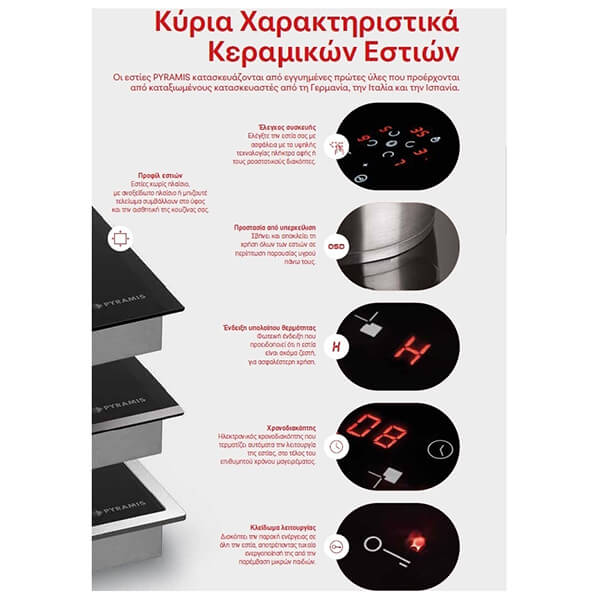 Οι εστίες PYRAMIS κατασκευάζονται από εγγυημένες πρώτες ύλες που προέρχονται από καταξιωμένους κατασκευαστές από τη Γερμανία, την Ιταλία και την Ισπανία. -Προστασία από υπερχείλιση: Σβήνει και αποκλείει τη χρήση όλων των εστιών σε περίπτωση παρουσίας υγρού πάνω τους. -Yπόλοιπο θερμότητας: Φωτεινή ένδειξη που προειδοποιεί ότι η εστία είναι ακόμα ζεστή, για ασφαλέστερη χρήση. -Χρονοδιακόπτης: Ηλεκτρονικός χρονοδιακόπτης που τερματίζει αυτόματα την λειτουργία της εστίας, στο τέλος του επιθυμητού χρόνου μαγειρέματος. -Κλείδωμα λειτουργίας: Διακόπτει την παροχή ενέργειας σε όλη την εστία, αποτρέποντας τυχαία ενεργοποίησή της από την παρέμβαση μικρών παιδιών. Χαρακτηριστικά Είδος: Κεραμική Εστία.Χειρισμός Συσκευής: Πλήκτρα Αφής.Επίπεδα Έντασης Λειτουργίας: 9.Γενικά χαρακτηριστικά: Ένδειξη Υπολοίπου Θερμότητας, Χρονοδιακόπτης, Κλείδωμα Λειτουργίας, Ασφάλεια Υπερχείλισης.Τελείωμα: Χωρίς πλαίσιο.Διαστάσεις: 290 x 510 x 50mm.2 Ζώνες μαγειρέματος: 18cm - 1800W, 14.5cm - 1200W.Xρώμα: Λευκό.Εγγύηση: 2 χρόνια.