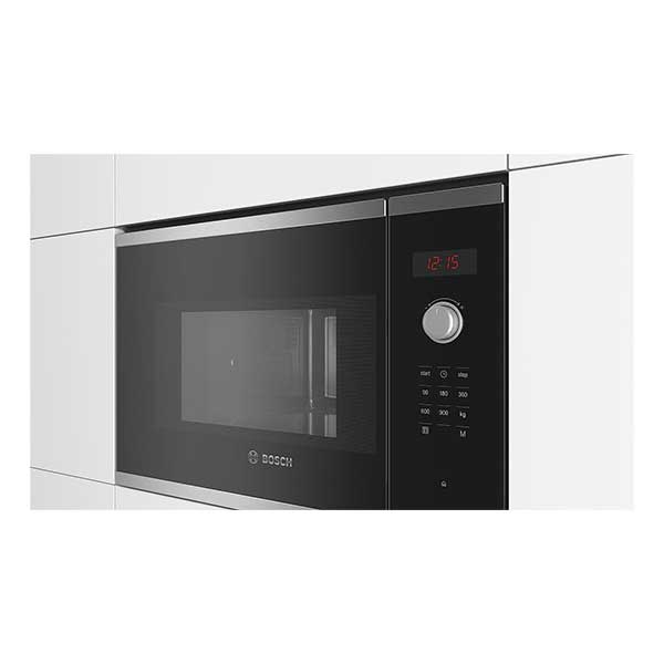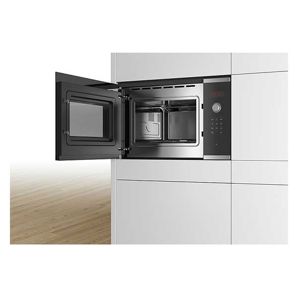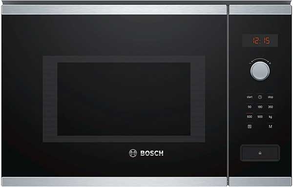 Eντοιχιζόμενος φούρνος μικροκυμάτων της Bosch με ισχύ 900 watt και χωρητικότητα 25 λίτρα. Διαθέτει ψηφιακή οθόνη με ενδείξεις για τον υπολειπόμενο χρόνο και τις επιλεγμένες ρυθμίσεις.