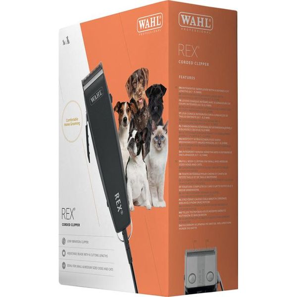 Η κουρευτική μηχανή ρεύματος για κατοικίδια REX της WAHL διαθέτει ηλεκτρομαγνητικό μοτέρ 3.000 rpm που προσφέρει υψηλή απόδοση, ακριβές αποτέλεσμα αλλά και σταθερή ισχύ. Έρχεται με λεπίδα ακριβείας "MADE IN GERMANY" από ανοξείδωτο ατσάλι υψηλής ποιότητας, ρυθμιζόμενο μήκος κοπής 0.7-3 mm, πλάτος κοπής 46 mm και 2 χτενάκια 6 και 9 mm για απόλυτη ευελιξία στο styling των κατοικίδιων. Διακρίνεται για την εργονομική της κατασκευή και είναι κατάλληλη για μικρού και μεσαίου μεγέθους σκύλους και γάτες.
